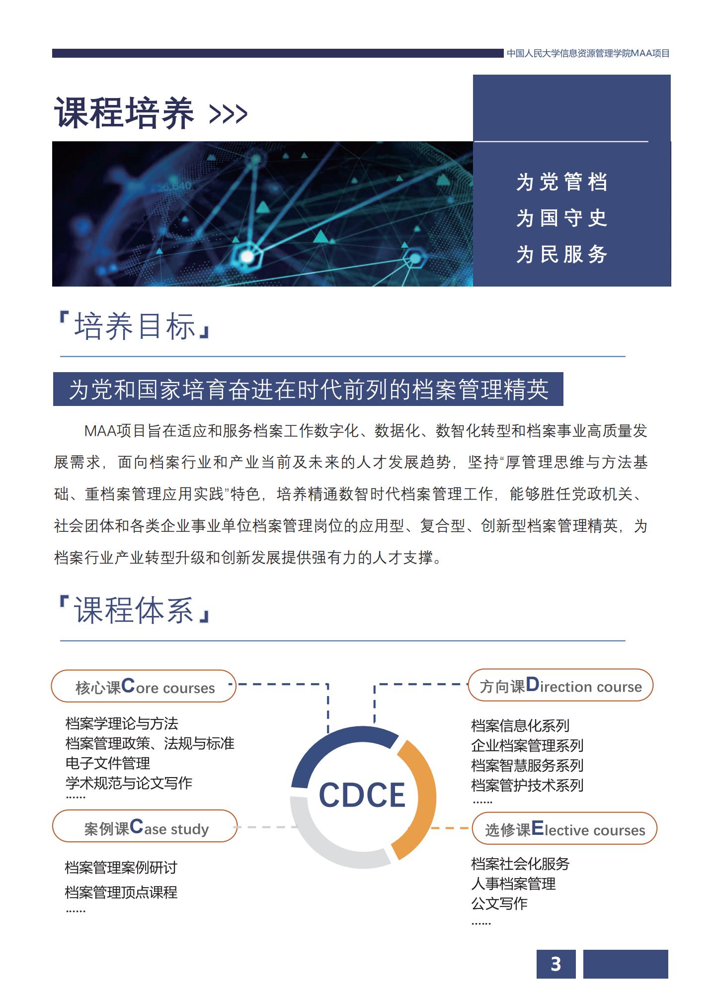 档案管理专硕(MAA)项目重点培养热爱祖国,具有良好的道德品质,理论基础扎实,实际工作能力强,胜任国家机构、政党团体和各类企业事业单位档案管理与数据管理的应用型、复合型、技能型人才。